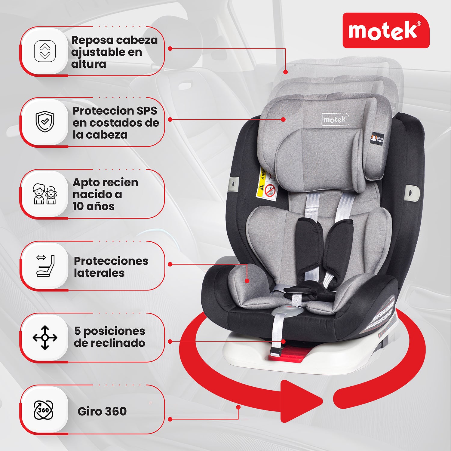 Los autoasientos de Motek ofrecen seguridad y adaptabilidad para acompañar el crecimiento de los niños desde el primer año hasta los 10 años aproximadamente. Están homologados bajo la norma europea ECE R44/04 y se instalan con el cinturón de seguridad de 3 puntos del vehículo.